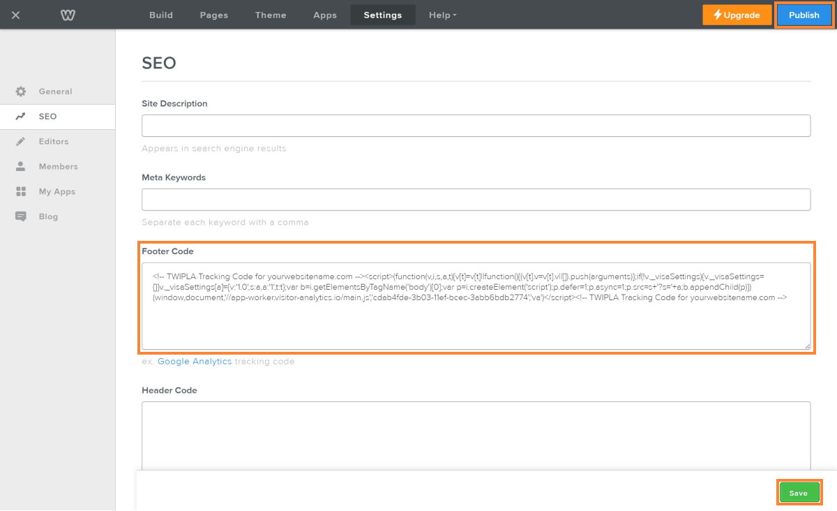 Hinweis: Die App beginnt noch nicht mit dem Tracking Ihrer Webseite. Folgen Sie den weiteren Schritten, um es zu starten. - Um das Tracking zu aktivieren, navigieren Sie zum Weebly Webseiten-Editor und klicken Sie auf Veröffentlichen, um Ihre Änderungen zu aktivieren.