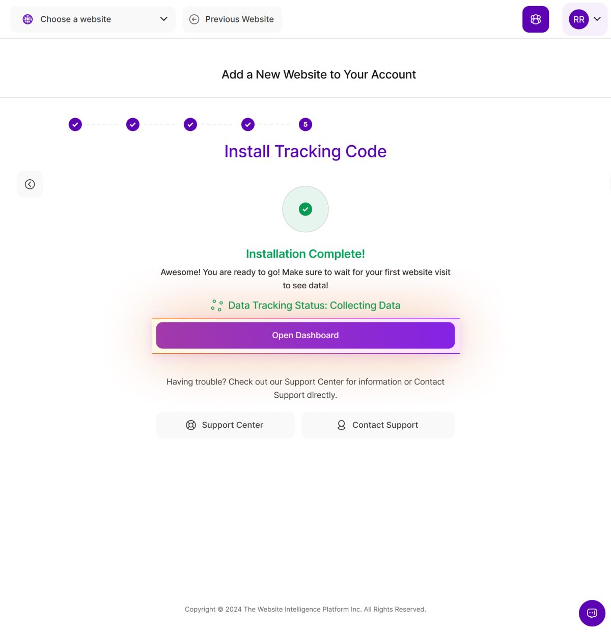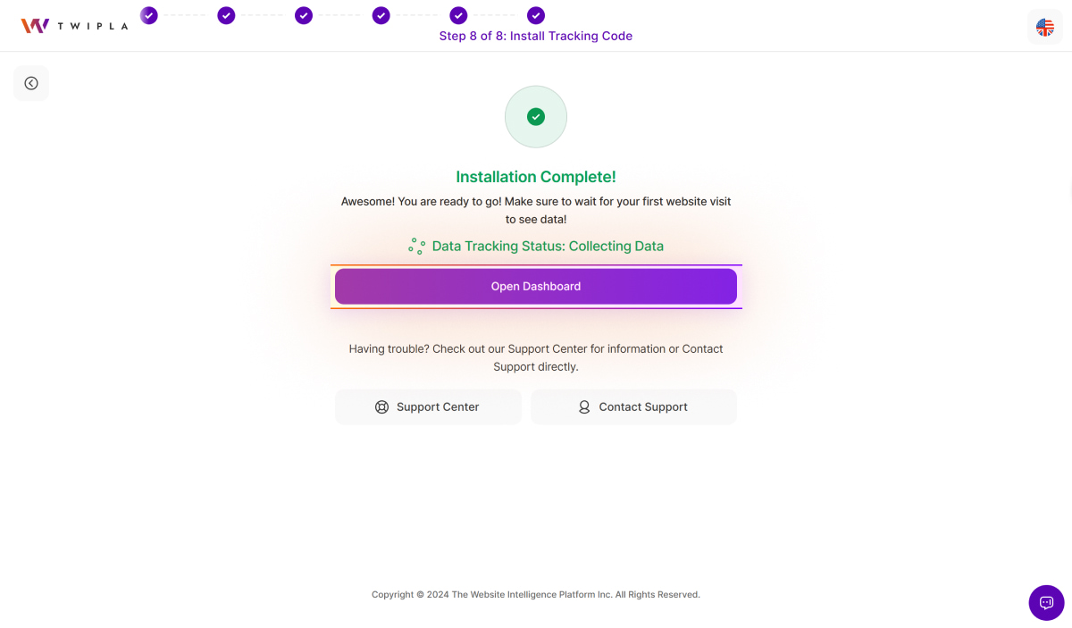 8. You're all set! Installation is now completed. Click Open Dashboard to access the Main Dashboards. You can visit your live website to verify the collection of website visits to the platform and reload the dashboard to see your initial statistics.